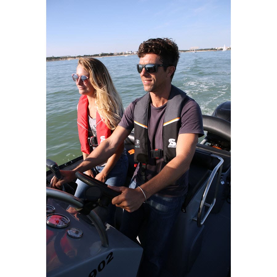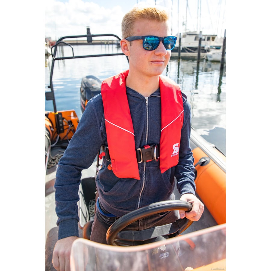 275N kellutusluokitettu ilmatäytteinen pelastusliivi integroiduilla valjailla.