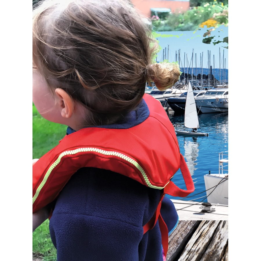 Pienten lasten (15-30 kg) 150N nosteluokitettu ilmatäytteinen pelastusliivi, jossa on helppokäyttöinen pikasolki, turvavaljas ja haaranauha.